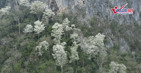 Từ xa nhìn lại, từng tán cây như những đám mây trắng vắt ngang sườn đồi, nổi bật giữa màu xanh bạt ngàn của núi rừng.
