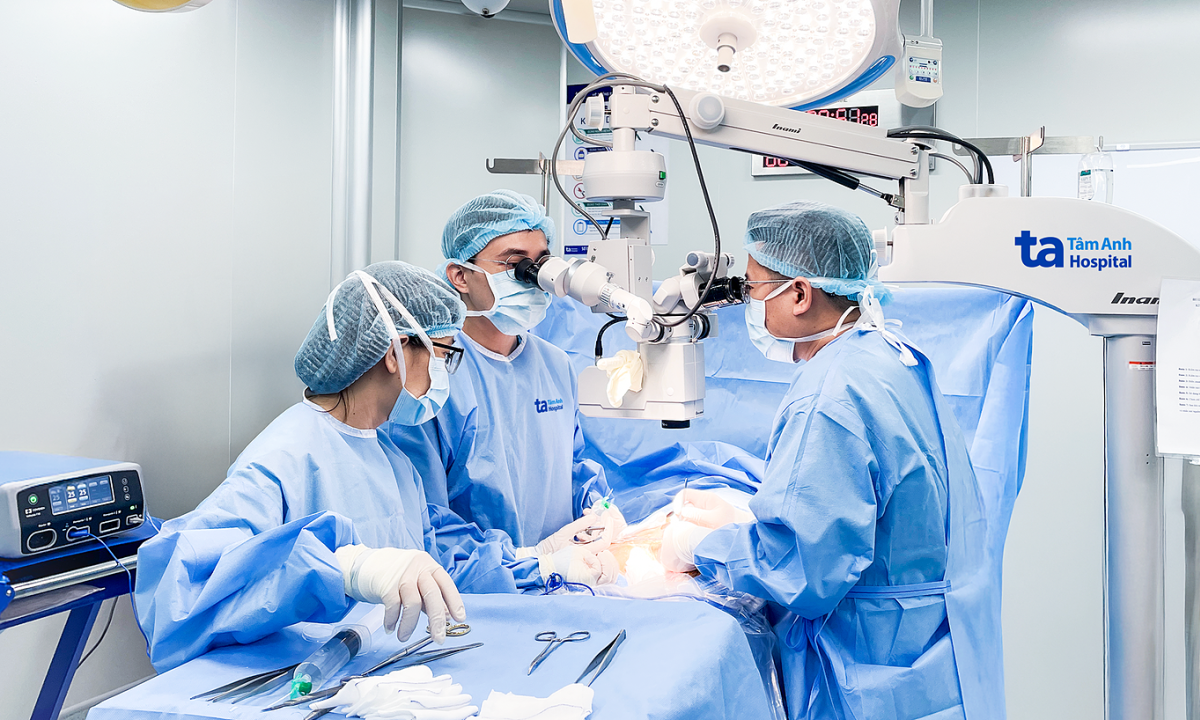 Bác sĩ Minh (giữa) phẫu thuật nối ống dẫn tinh cho anh Tài. Ảnh: Bệnh viện Đa khoa Tâm Anh