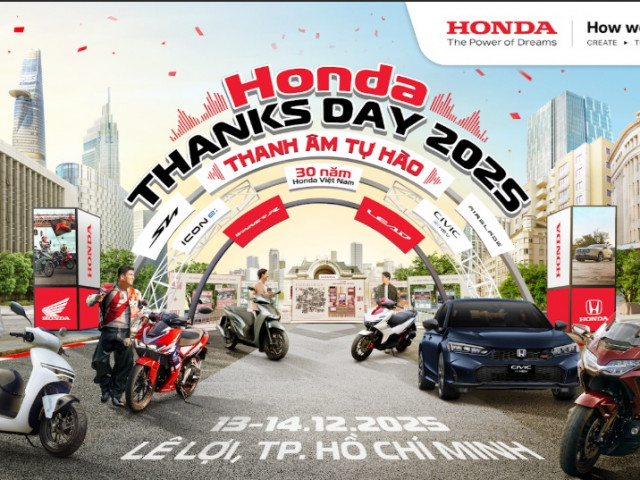 Honda Việt Nam (HVN) sẽ tổ chức sự kiện thường niên Honda Thanks Day 2025 với chủ đề “Thanh âm tự hào”. Sự kiện sẽ diễn ra từ ngày 13 đến 14/12 trên đại lộ Lê Lợi (TP.HCM).