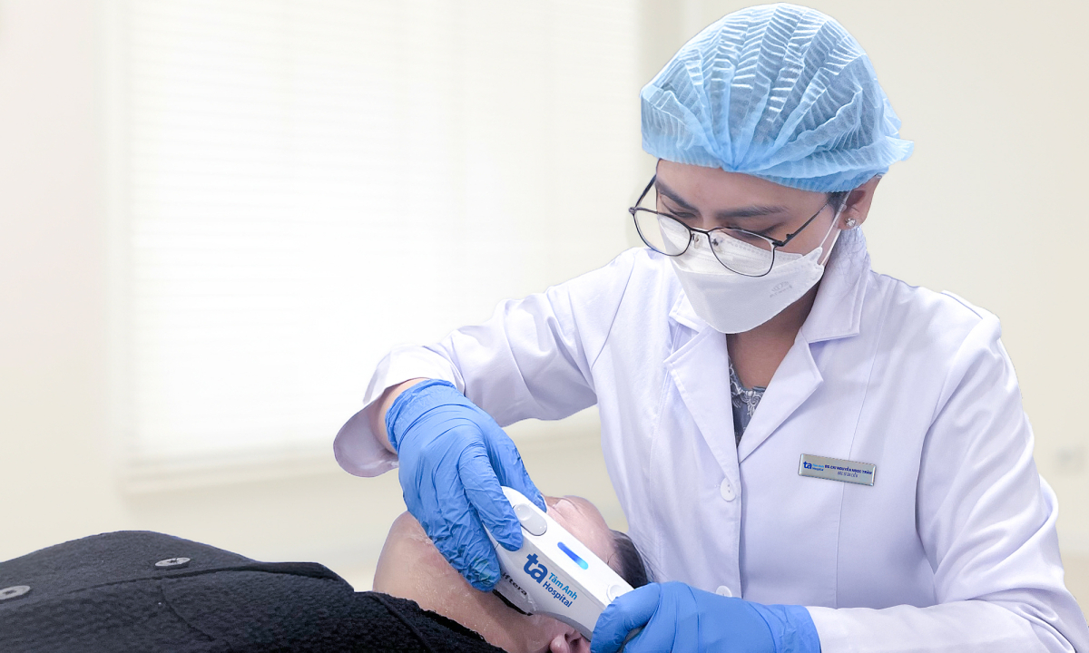 Bác sĩ sử dụng sóng siêu âm hội tụ để săn chắc vùng cằm cho chị Thu. Ảnh: Bệnh viện Đa khoa Tâm Anh