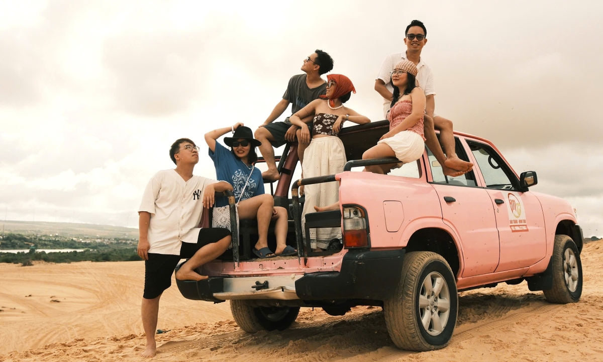 Nhóm du khách trẻ lên kế hoạch du lịch Mũi Né tự túc bằng AI kết hợp tìm kiếm thông tin từ các nền tảng mạng xã hội. Ảnh: Mai Trung