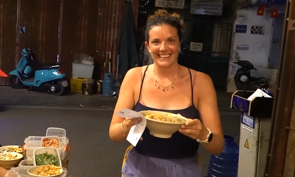 Khách nước ngoài ăn chay vỉa hè, tự phục vụ ở phố cổ Hà Nội
