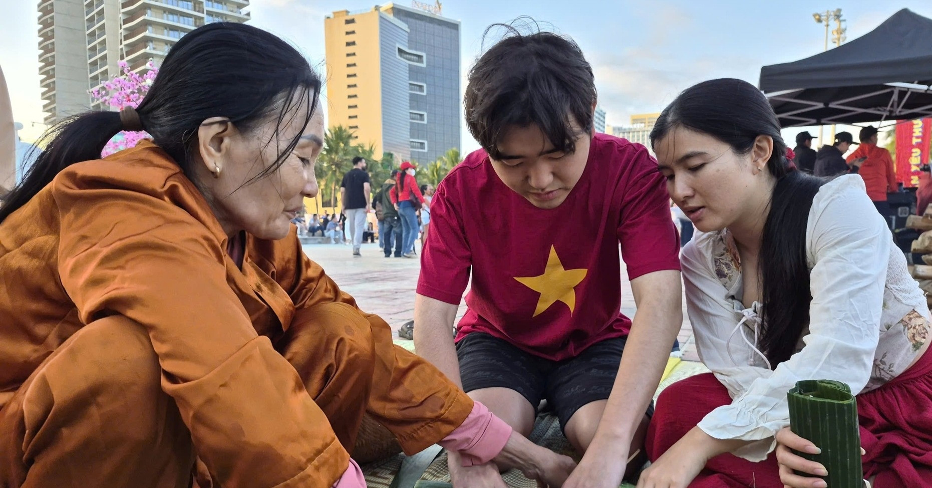 Khách quốc tế thích thú ăn mứt Tết, tự tay gói bánh chưng ở bãi biển Đà Nẵng