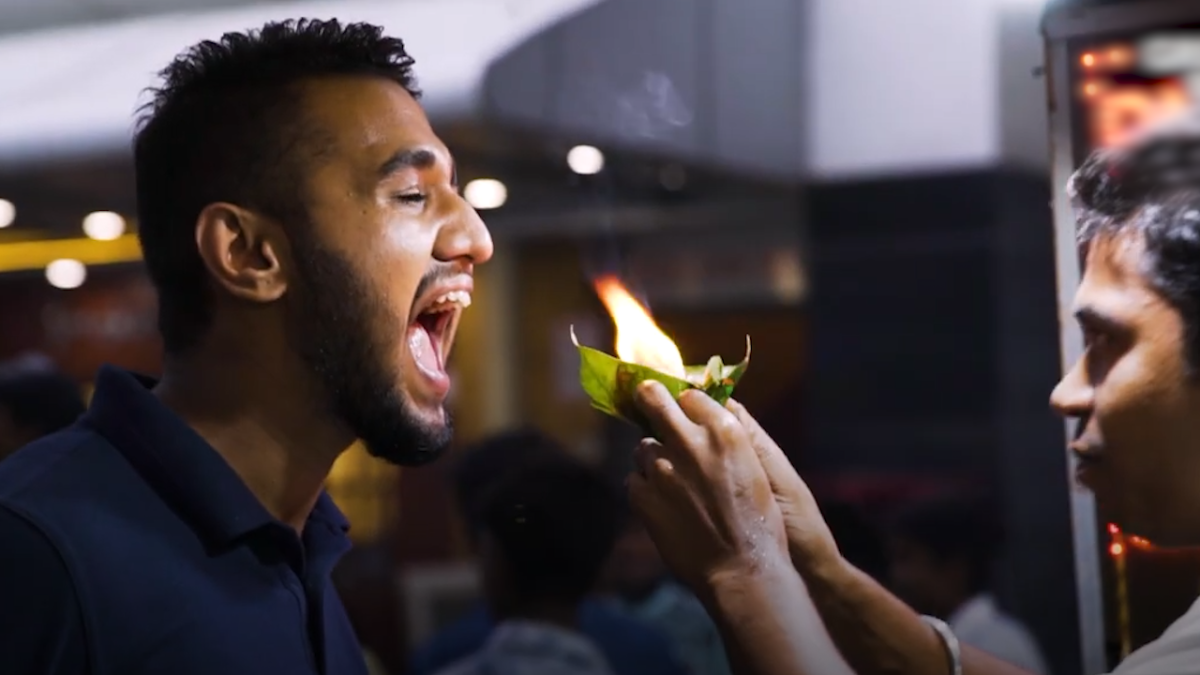 Thứ bảy, 15/11/2025, 11:10 (GMT+7) Khách thót tim ăn món trầu bốc lửa của Ấn Độ Nhiều du khách lo lắng, hồi hộp khi chủ quán đưa thẳng miếng trầu bốc lửa vào miệng, món ăn đường phố có vị the cay, khói nhẹ, đem đến trải nghiệm vừa lạ vừa kích thích. Món trầu bốc lửa trong miệng ở Ấn Độ Mai Anh