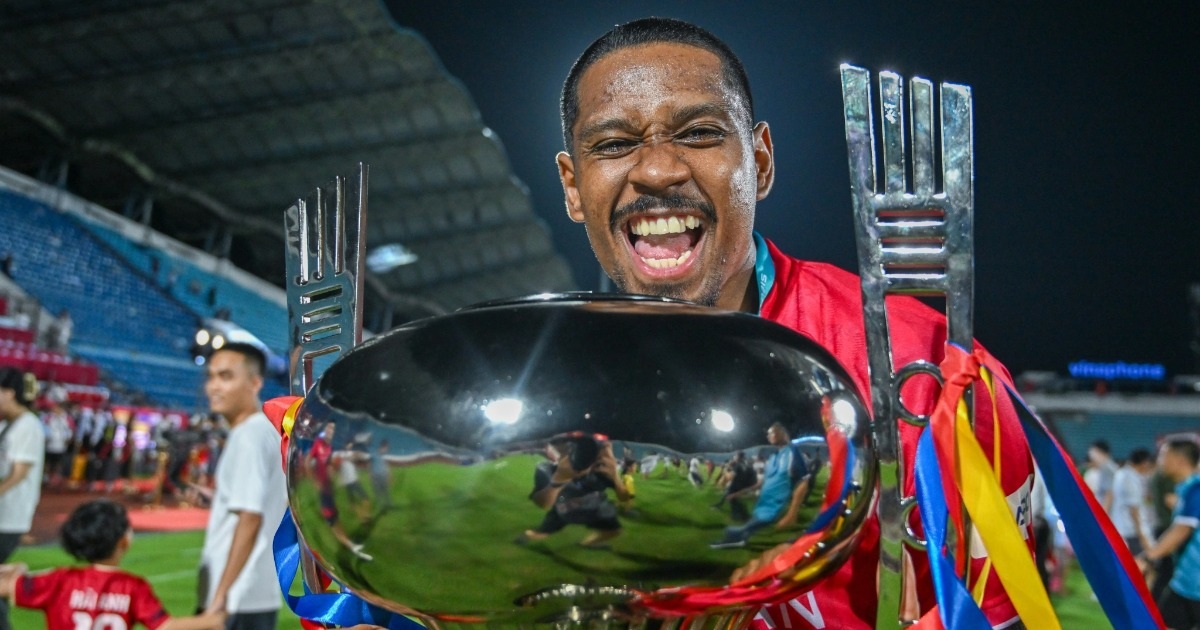 HLV Polking nở nụ cười rạng rỡ, cùng đội trưởng Quang Hải nâng cao chiếc cúp vô địch, biểu tượng cho chiến thắng và nỗ lực không ngừng của cả tập thể.