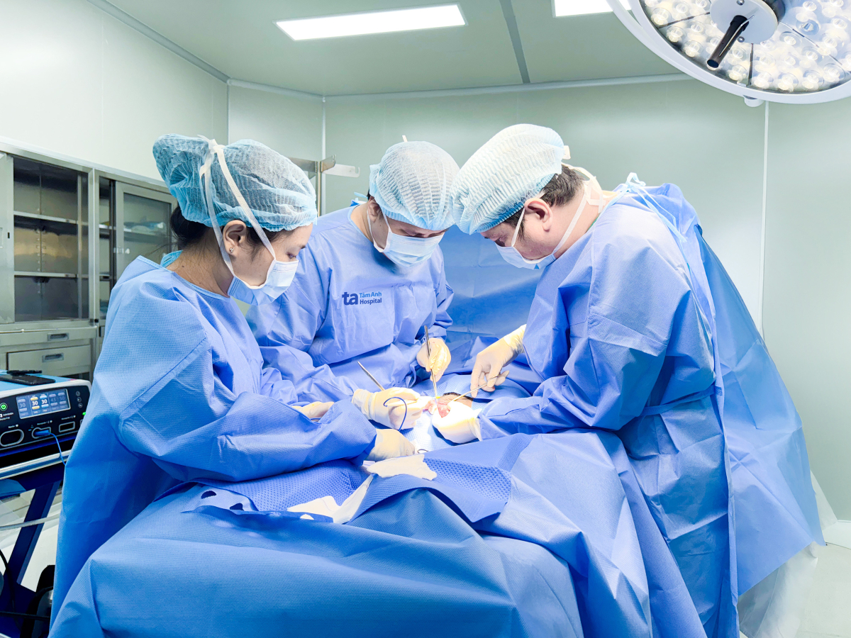 Bác sĩ Thiện (giữa) cùng êkíp phẫu thuật cắt khối u bã đậu cho người bệnh. Ảnh: Phương Trinh
