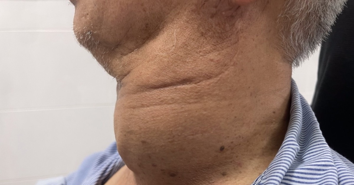 Ông Mạnh (78 tuổi, Long Biên) phát hiện khối u ở tuyến giáp cách đây 15 năm, tuy nhiên không điều trị do khối u lành tính. Khoảng 4 năm trở lại đây, khối u to dần gây khó khăn trong sinh hoạt.