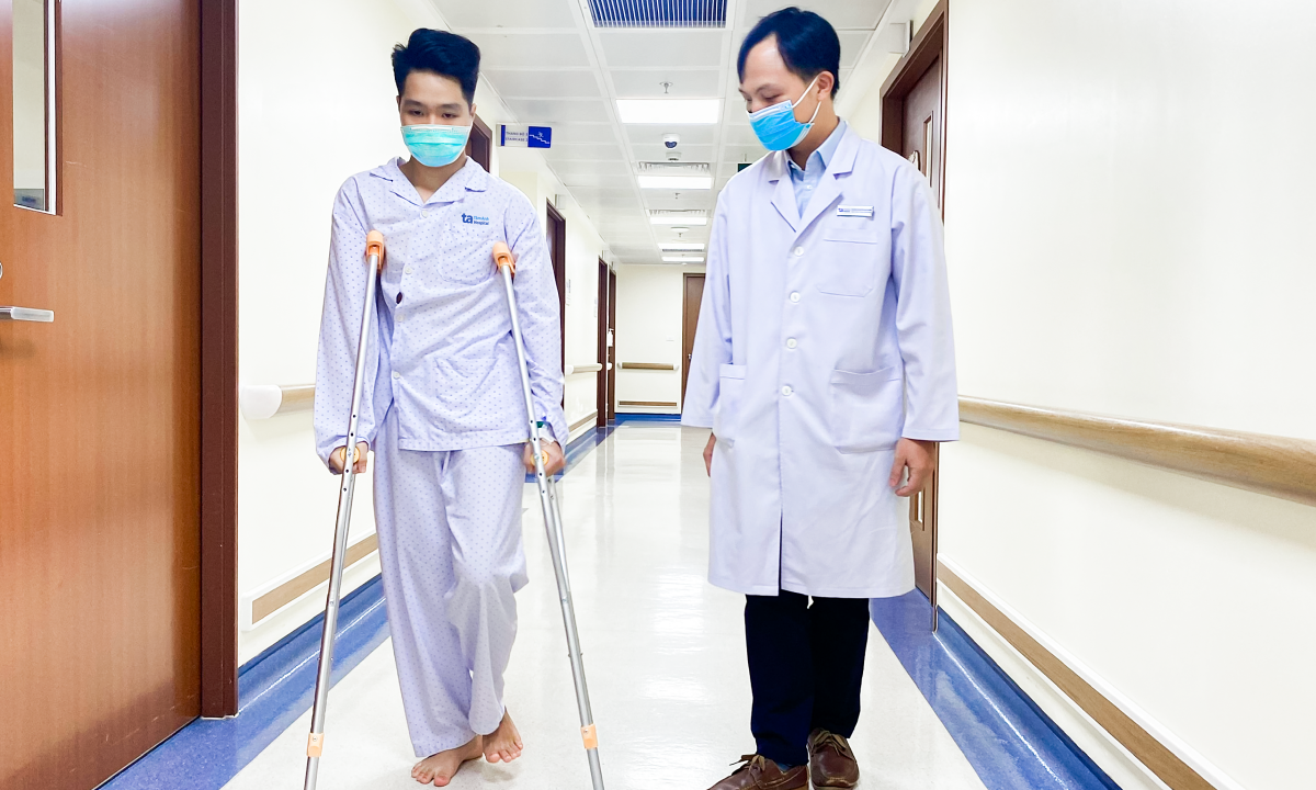 Phát tập đi lại cùng bác sĩ Trường vào ngày thứ 3 sau phẫu thuật. Ảnh: Bệnh viện Đa khoa Tâm Anh