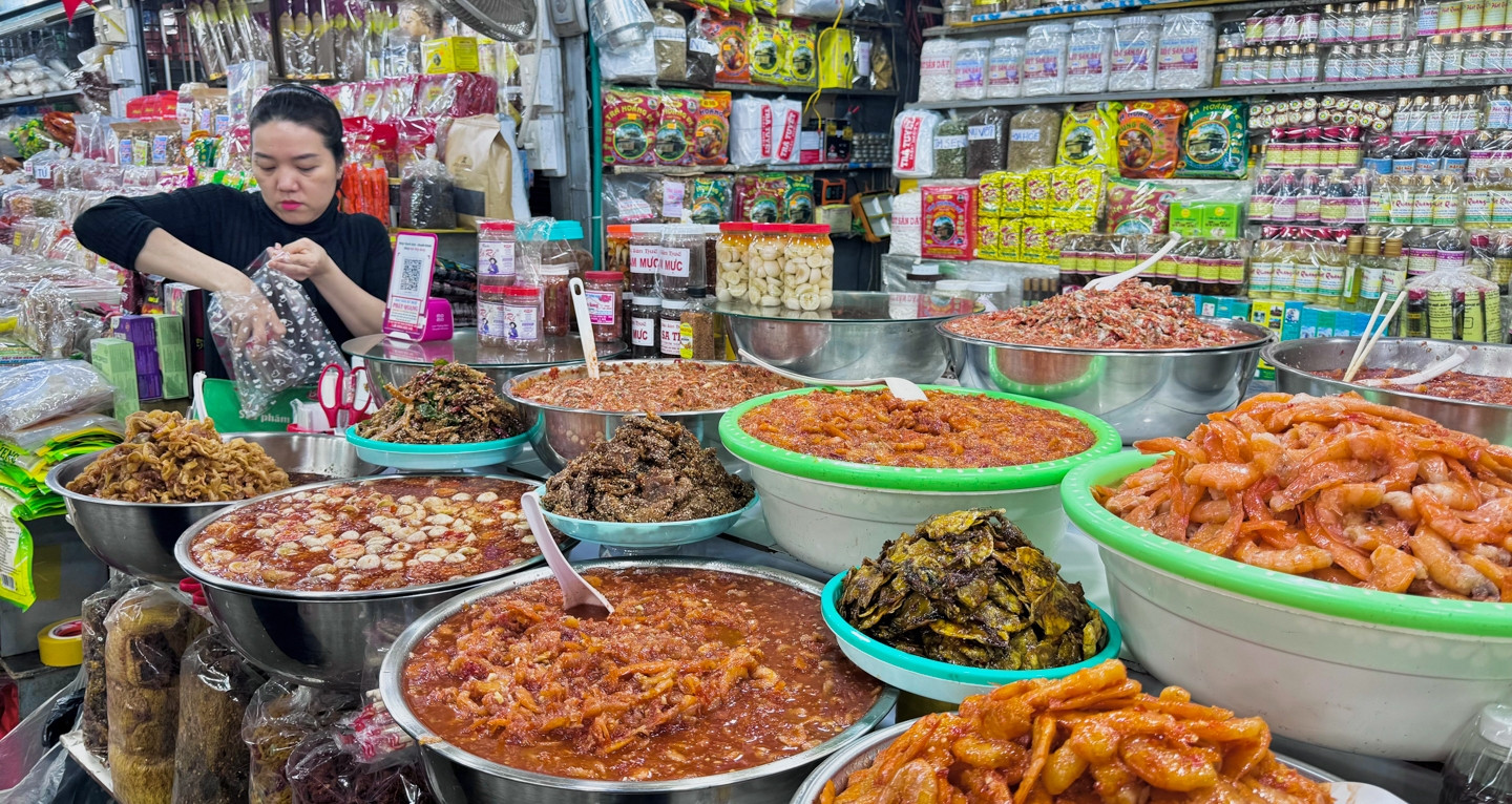 Nổi bật nhất ở tầng 1 là hàng chục gian hàng bán mắm, với đủ các loại mắm ruốc, mắm cà, mắm cá rò, tôm chua, mực rim mắm, cá rim…