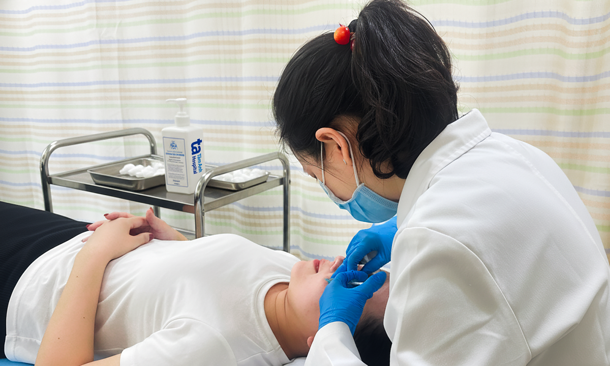 Bác sĩ tiêm HA để giảm khô và làm sáng da cho chị Bella Mai. Ảnh: Bệnh viện Đa khoa Tâm Anh