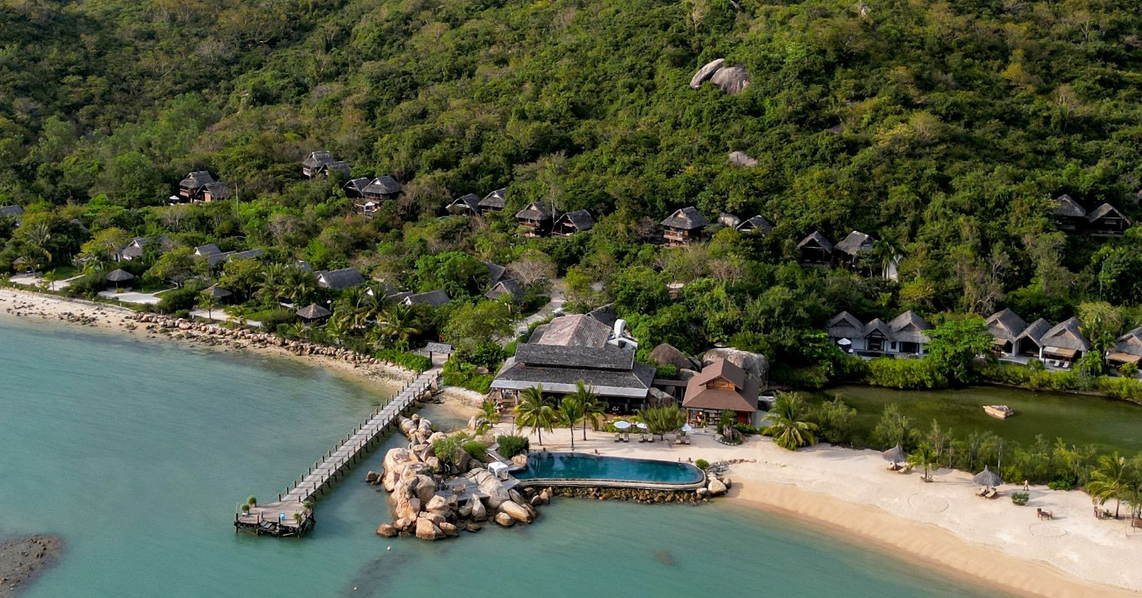Tại đây, bạn sẽ tìm thấy 33 căn villa ẩn mình dưới những tán cây, nằm yên trên sườn đồi hướng mặt về bãi biển cát sóng vỗ nhẹ nhàng. Thiết kế mộc mạc với tre, gỗ, đá và mái lá, nhưng vẫn đầy đủ tiện nghi – từ hồ bơi riêng, hiên nhà siêu “chill” đến quản gia riêng 24/7 luôn sẵn sàng hỗ trợ bạn “từ A đến Z” mà vẫn đảm bảo riêng tư.