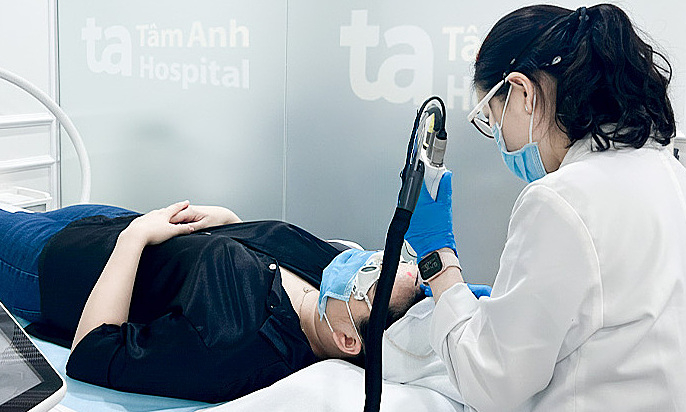 Bác sĩ Trang sử dụng laser 6D điều trị sẹo trán cho chị Phương. Ảnh: Bệnh viện Đa khoa Tâm Anh