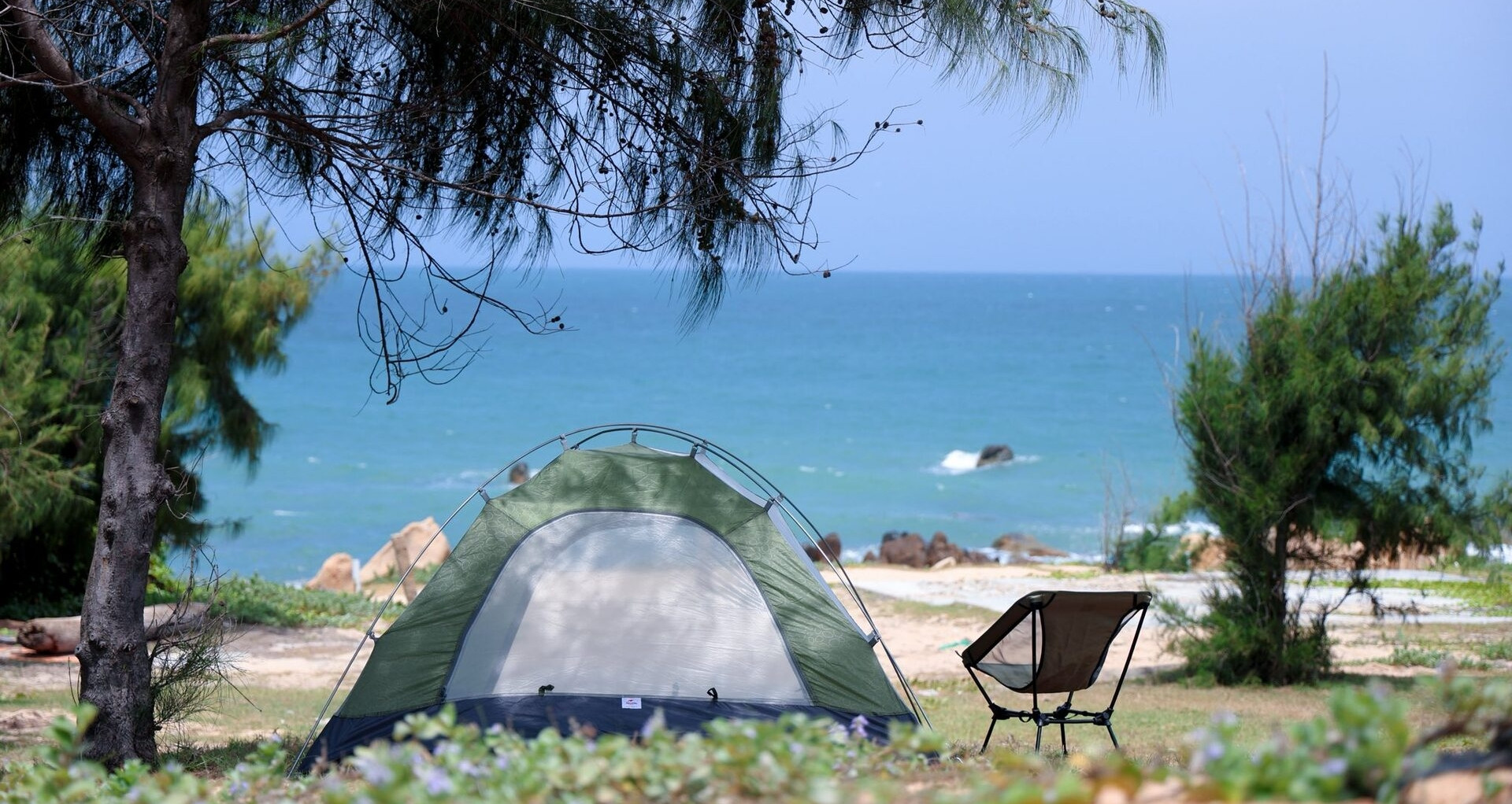 “Nhóm mình dựng lều ở bãi đất bằng phẳng bên rừng dương với thảm cỏ xanh êm ái. Thời tiết đẹp, nắng to, nước biển xanh ngắt, gió thổi mát rượi”, anh Tường chia sẻ.