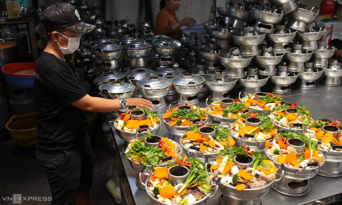 17h thứ ba, quận Bình Thạnh, TP HCM mưa lớn. Đầu đường Nguyễn Xí, phường 13, một quán lẩu vẫn tấp nập khách ra vào. Oanh, thực khách từ TP Thủ Đức cùng hơn 6 người bạn đang ngồi ăn lẩu, chia sẻ, quán là địa chỉ “ruột” của nhóm. “Cần địa điểm ăn uống ngon, rẻ tụi mình đều đến đây. Chỗ này bán món dân dã, kiểu gia đình, đám tiệc ở miền Tây. Mình thích nhất là lẩu cù lao với rất nhiều rau củ, thịt, lòng heo, nước dùng ngọt rất hợp vị”, Oanh đùa, mỗi lần đến quán cô có cảm giác như đang ăn tiệc cưới xưa.