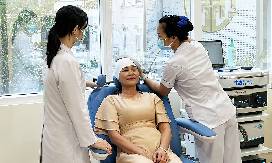 Bác sĩ dùng phương pháp kích thích từ trường xuyên sọ điều trị cho người rối loạn lo âu. Ảnh: Bệnh viện Đa khoa Tâm Anh