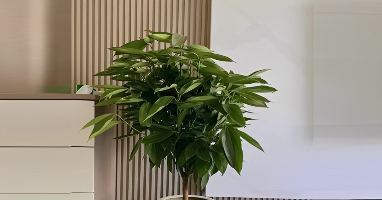 Với thân gỗ chắc khỏe, tán lá xanh đậm và đều, cây tạo cảm giác “có gốc, có nền”, giúp phòng khách trở nên vững vàng, yên tĩnh và dễ chịu hơn.