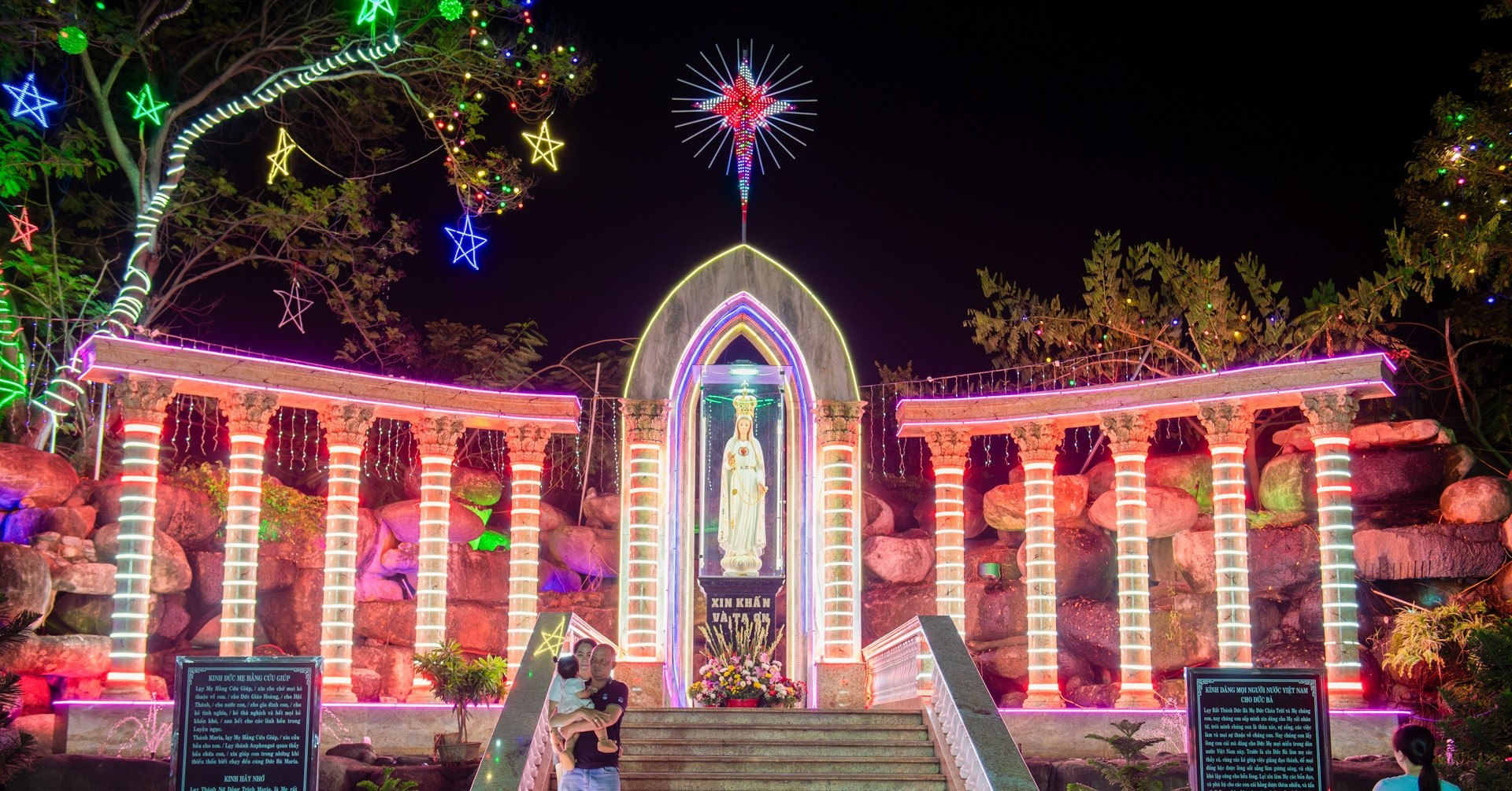 Khuôn viên nhà thờ được đầu tư trang trí sớm với hệ thống ánh sáng nghệ thuật kết hợp các tiểu cảnh tái hiện những câu chuyện trong Kinh Thánh