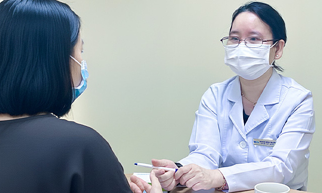Phó giáo sư Lâm khám, tư vấn bệnh lupus ban đỏ cho chị Thúy. Ảnh: Bệnh viện Đa khoa Tâm Anh