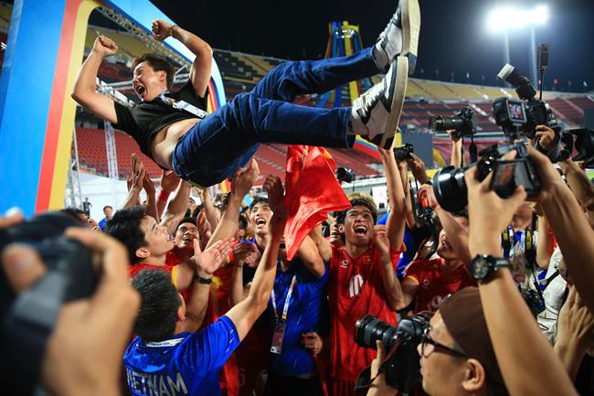 HLV Kim Sang Sik được học trò công kênh sau chiến thắng ở trận chung kết SEA Games 33