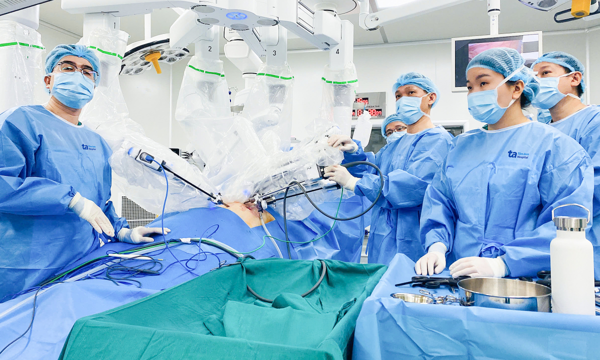 Êkip bác sĩ mổ cắt u thận phải cho chị An với sự hỗ trợ của robot Da Vinci Xi. Ảnh: Bệnh viện Đa khoa Tâm Anh