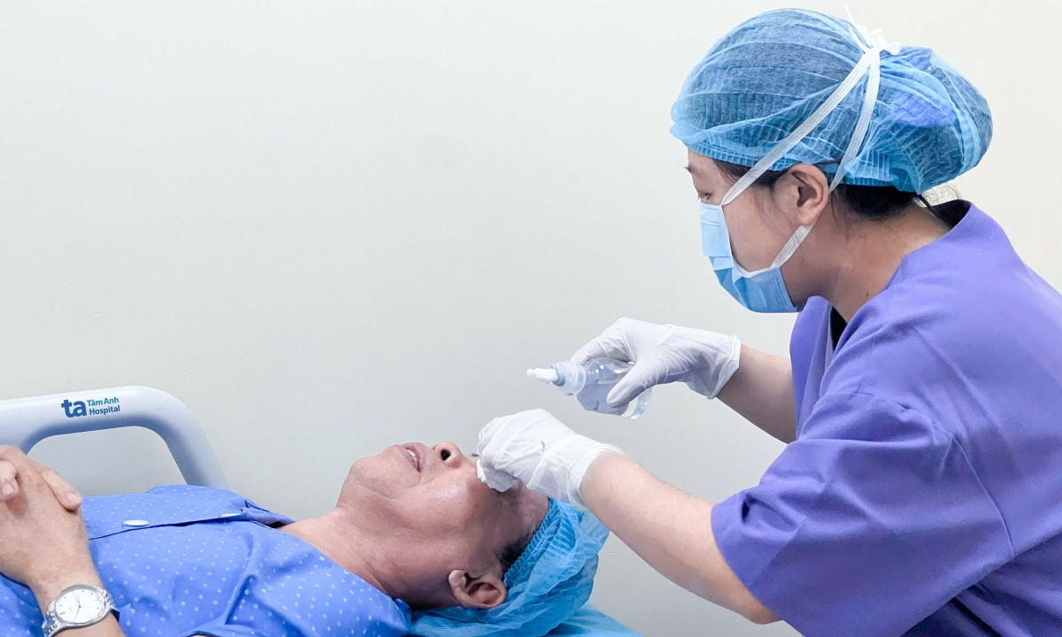 Nhân viên y tế nhỏ thuốc rửa mắt, sát trùng vùng mắt cho ông Thanh trước phẫu thuật. Ảnh: Bệnh viện Đa khoa Tâm Anh