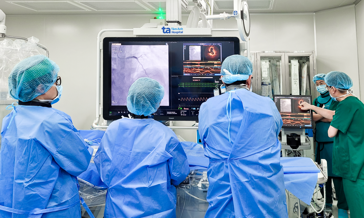 Chụp cắt lớp kết quang nội mạch (OCT) cho thấy một mảng xơ vữa không ổn định (mảng xơ vữa mềm) đã bị vỡ, hình thành huyết khối gây hẹp nghẽn động mạch liên thất trước, dẫn đến cơn nhồi máu cơ tim cấp. Người bệnh được thở máy, dùng thuốc vận mạch, dụng cụ hỗ trợ tim (bóng đối xung động mạch chủ) rồi được can thiệp tái thông mạch vành.