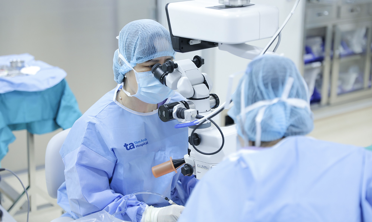 Bác sĩ phẫu thuật điều trị đục thủy tinh thể mắt trái cho bà Nhung. Ảnh: Bệnh viện Đa khoa Tâm Anh