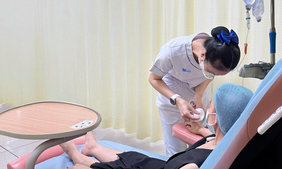 Điều dưỡng truyền thuốc cho chị Hằng trên ghế chuyên dụng dễ dàng điều chỉnh tư thế, êm ái. Ảnh: Bệnh viện Đa khoa Tâm Anh