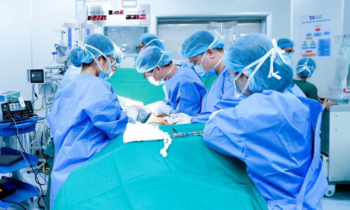 Êkíp sinh thiết hạch gác cửa, đoạn nhũ và tái tạo ngực cho chị Dương. Ảnh: Bệnh viện Đa khoa Tâm Anh
