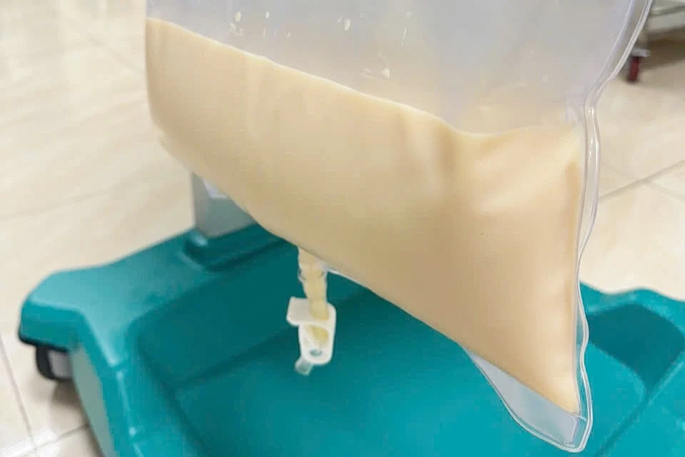Bác sĩ chỉ định lọc máu thay huyết tương khẩn cấp. Sau hai giờ, khoảng 500 ml huyết tương màu trắng đục như sữa được loại bỏ. Bình thường huyết tương màu vàng nhạt trong suốt.