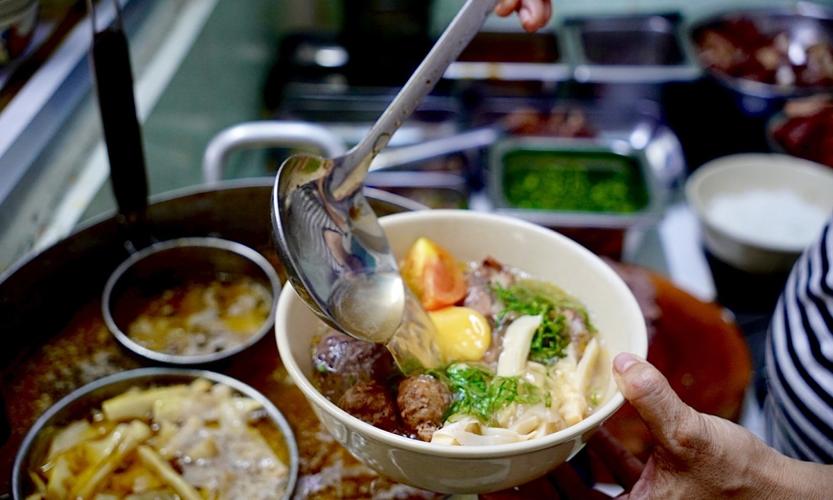 Phần bún măng bò thập cẩm với topping thịt, bắp, bò viên, trứng chần. Ảnh: Tuấn Anh