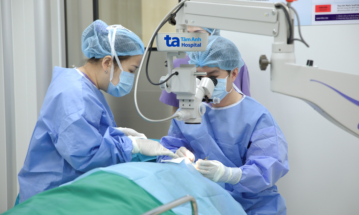 Bác sĩ Phúc (phải) phẫu thuật loại bỏ mộng thịt mắt phải cho bà Thùy. Ảnh: Bệnh viện Đa khoa Tâm Anh