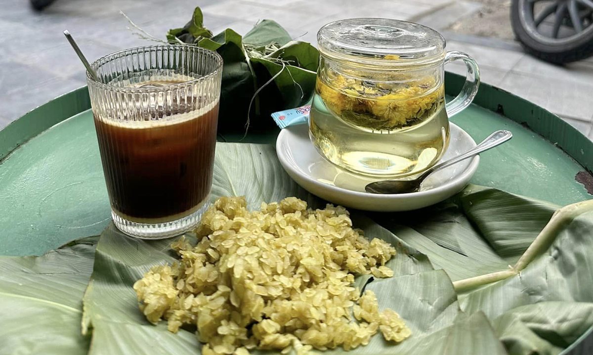 Cà phê vỉa hè Hà Nội với cốm. Ảnh: Thanh Thùy