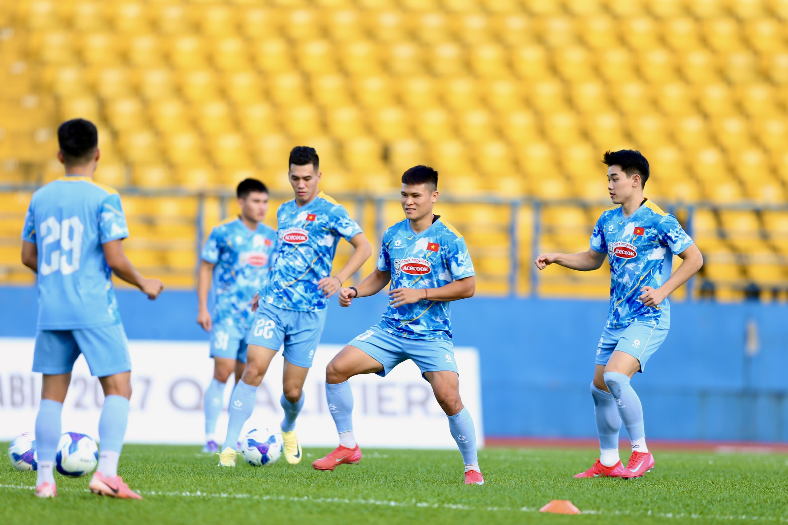 Do phần lớn các tuyển thủ vừa trải qua loạt trận V.League, HLV Kim Sang Sik chủ động cho toàn đội tập nhẹ để thả lỏng và giải toả thể trạng. Buổi tập diễn ra trong không khí vui vẻ, thoải mái. Sau màn khởi động, ĐT Việt Nam triển khai các bài tập kỹ chiến thuật nhẹ nhàng.