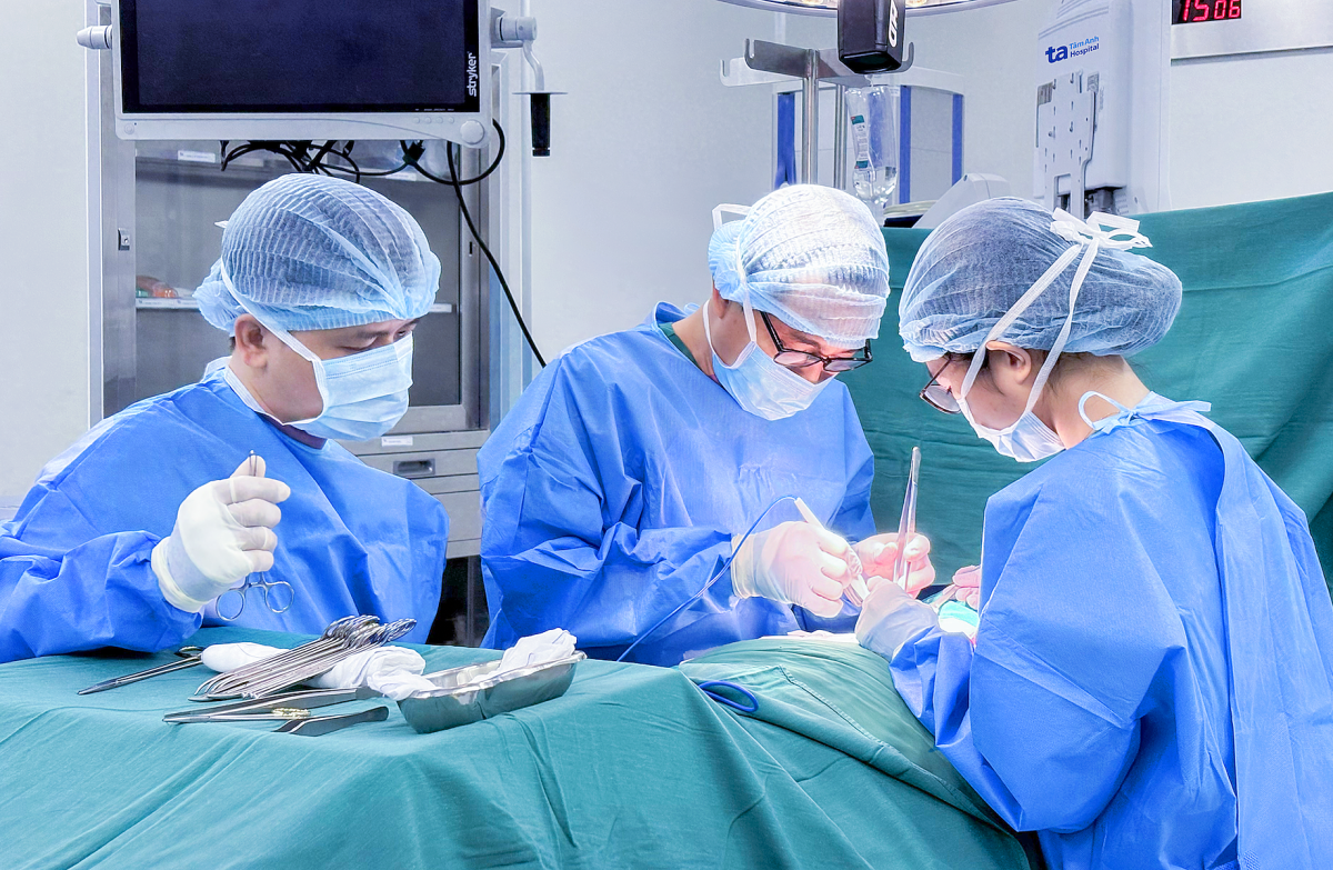 Bác sĩ Huân (giữa) và êkíp phẫu thuật cho bệnh nhân Nghề. Ảnh: Bệnh viện Đa khoa Tâm Anh