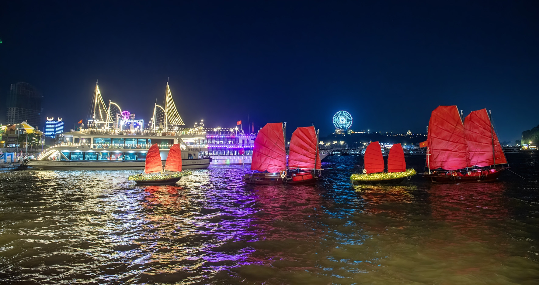 Tâm điểm của đêm khai trương là màn thủy diễn thuyền buồm đỏ, hình tượng biểu trưng của du lịch miền di sản. Mở màn là sự xuất hiện được dàn dựng công phu của đội hình 6 chiếc thuyền buồm đỏ thắm.