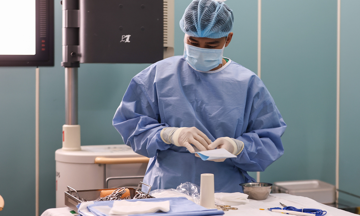 Học viên thực hành trên mô hình xương nhân tạo (Sawbone) – công cụ chuẩn trong đào tạo phẫu thuật chỉnh hình, giúp làm quen thao tác trước khi thực hành trên bệnh nhân thực tế. Ảnh: Bệnh viện cung cấp