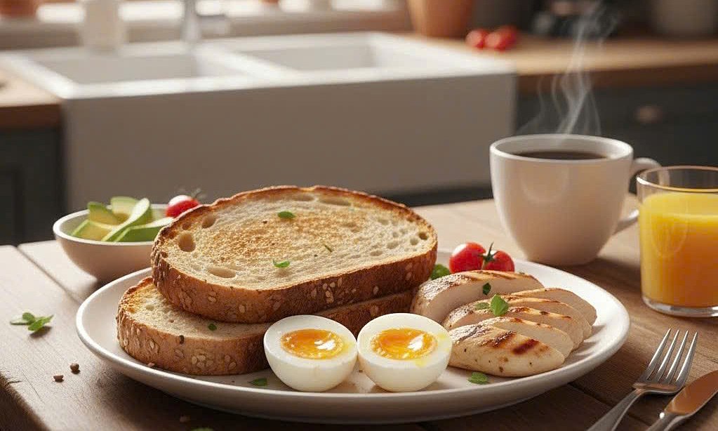 Bánh mì nguyên cám với trứng luộc là bữa sáng phù hợp cho người gan nhiễm mỡ. Ảnh được tạo bởi AI