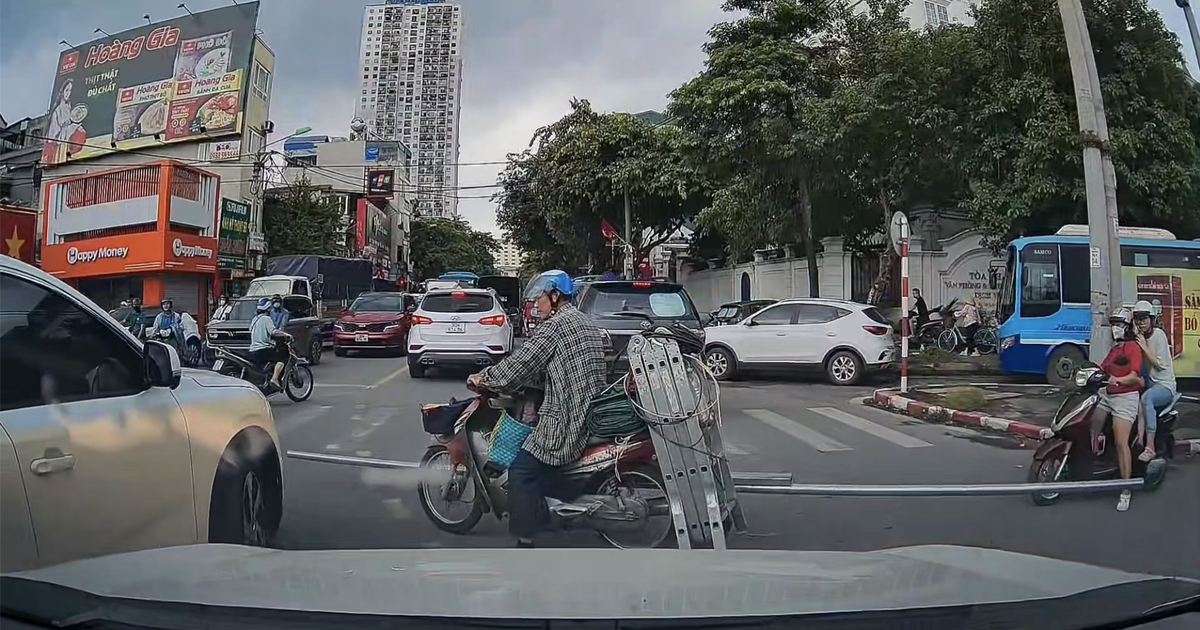 Video cho thấy người đàn ông đi xe máy chở khá cồng kềnh, với một thanh trông giống kim loại, dài gấp 3 lần xe, quệt vào thân ô tô khi qua giao lộ.