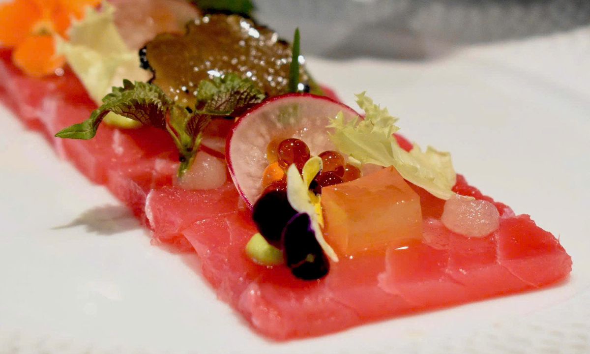 Gỏi cá ngừ đại dương (tuna carpaccio) trong một nhà hàng nhận danh hiệu Michelin Selected ba năm liên tiếp, là sự hòa quyện giữa kỹ thuật carpaccio châu Âu với nguyên liệu bản địa Việt Nam.