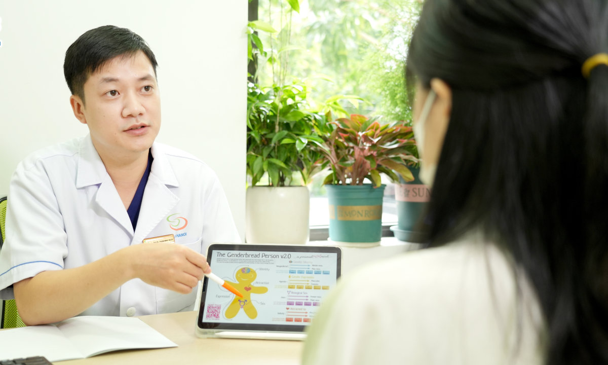 Bác sĩ Phạm Minh Ngọc tư vấn cho một bệnh nhân gặp rối loạn tình dục. Ảnh: Bệnh viện cung cấp