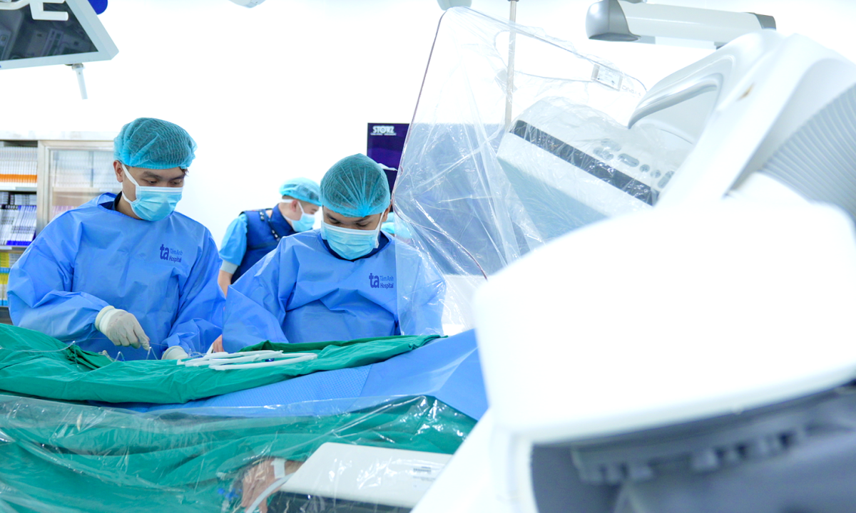 Êkíp đặt stent động mạch vành phải dưới hướng dẫn của siêu âm trong lòng mạch (IVUS). Từ lúc bác sĩ tiếp nhận người bệnh cấp cứu đến khi bóng nong mạch được bơm tái thông dòng chảy (door-to-balloon) chưa đến đầy 30 phút, rút ngắn so với ngưỡng khuyến cáo của Hiệp hội Tim mạch Mỹ (AHA/ACC) là dưới 90 phút. Tái tưới máu cơ tim kịp thời giảm nguy cơ biến chứng và bảo tồn chức năng tim.