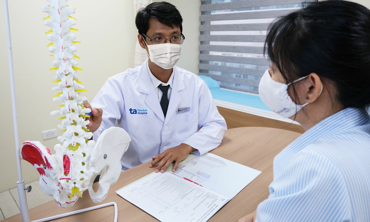 Bác sĩ Duận giải thích tình trạng cột sống cho người bệnh. Ảnh: Bệnh viện Đa khoa Tâm Anh