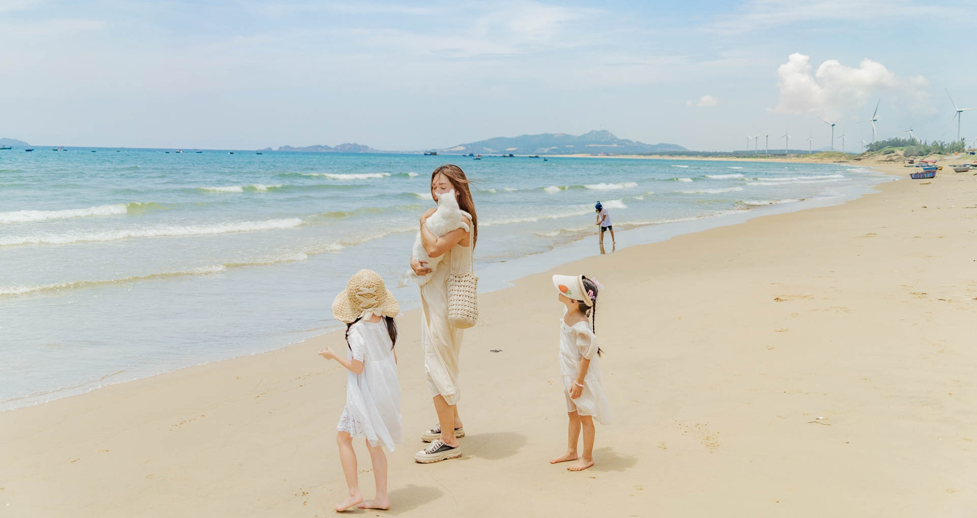 Bãi biển ở đây rất thoải, bờ cát trắng và nước trong, xanh, phù hợp với cả gia đình có trẻ nhỏ. Từ bãi biển có thể nhìn thấy cánh đồng điện gió, tạo nên góc check-in đẹp mắt.