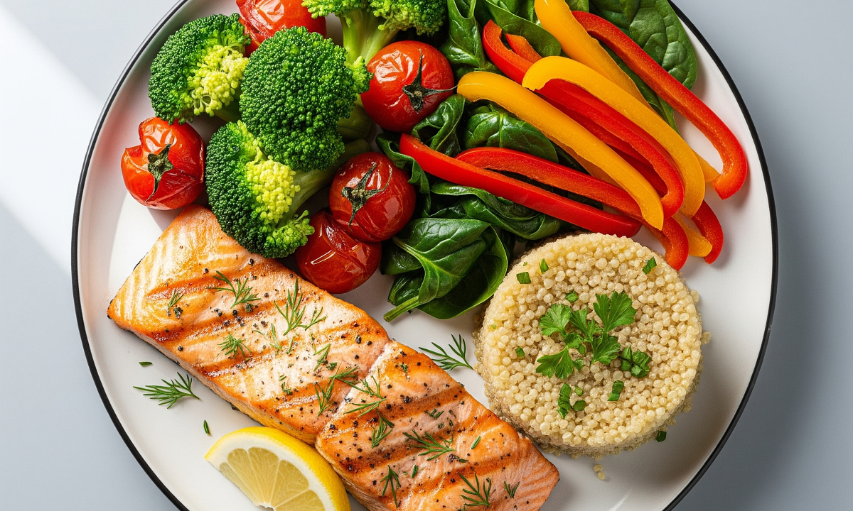 Thức ăn nhiều protein, chất xơ giúp no lâu, hỗ trợ giảm cân. Ảnh được tạo bởi AI