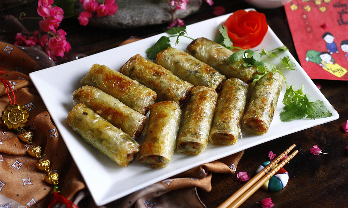 Nem rán thường là món khai vị, nhưng cũng có thể là một bữa chính, kết hợp cùng bún, cơm, ăn kèm rau sống, dưa góp và nước mắm chua ngọt. Ảnh: Song Anh