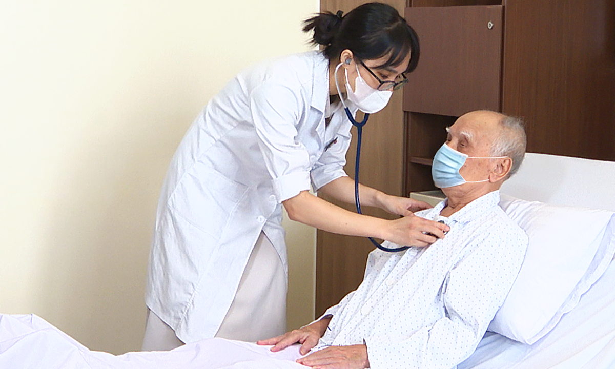 Bác sĩ Hồng Vân đang kiểm tra sức khỏe cho ông Quỳnh trước khi ra viện. Ảnh: Bệnh viện Đa khoa Tâm Anh