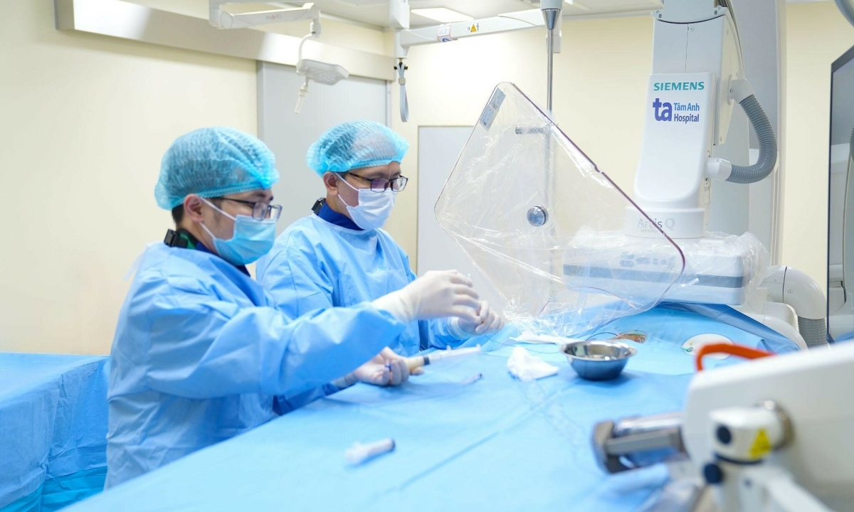 PGS Hiền cùng êkíp đặt stent tái thông tĩnh mạch cho ông Dũng. Ảnh: Bệnh viện Đa khoa Tâm Anh