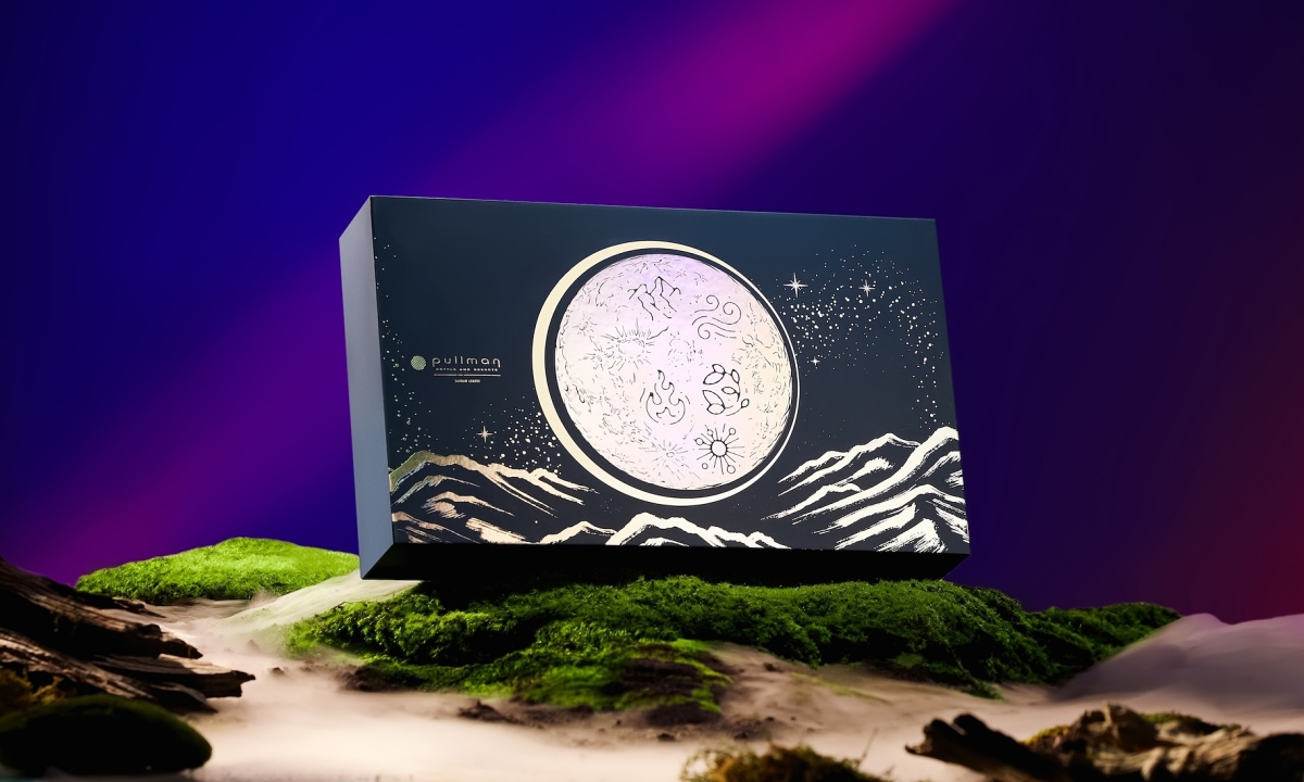 Hộp quà Trung thu 2025 của Pullman Saigon Centre có tên “Ngũ hành bảo nguyệt”, tượng trưng cho sự cân bằng, kết nối và thịnh vượng thông qua thiết kế và hương vị. Hộp quà có tông chủ đạo màu xanh dương trầm với điểm nhấn là hình vẽ vầng trăng tròn trên nền mây và núi.