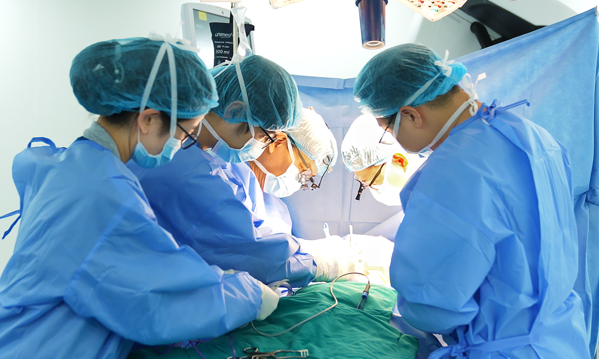 Êkíp phẫu thuật chuyển hướng dòng máu bằng cách bắc cầu giữa động mạch chủ lên và các mạch máu vùng cổ để tạo đường dẫn mới đưa máu lên não, sau đó, đặt stent graft trong lòng mạch để loại bỏ túi phình. Động mạch chủ lên của bệnh nhân giãn gần 40 mm, vượt quá giới hạn cho phép để đặt stent graft an toàn. Để xử lý, êkíp tạo hình thu nhỏ động mạch chủ bằng cách bọc vật liệu nhân tạo quanh đoạn mạch giãn và khâu thu hẹp lại, đưa đường kính từ 40 mm về khoảng 32 mm, khít với kích thước stent. Tiếp đến, êkíp đặt stent graft bao phủ vị trí xuất phát của túi phình, ngăn không cho máu chảy vào bên trong vùng phình. Nhờ đó, dòng máu được dẫn theo lòng mạch bình thường, còn túi phình không chịu áp lực, dần co nhỏ và xơ hóa theo thời gian.